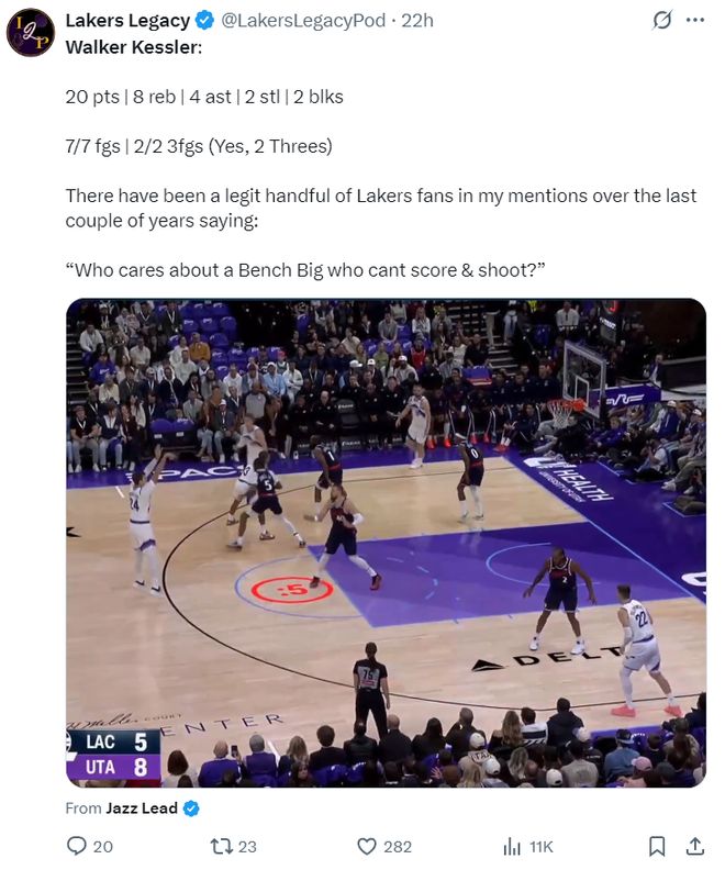 湖人记者Ryan Rueda看到凯斯勒的表现后转发了凯斯勒的数据并@湖人官方:要尽一切努力让凯斯勒来湖人搭档卢卡-东契奇。